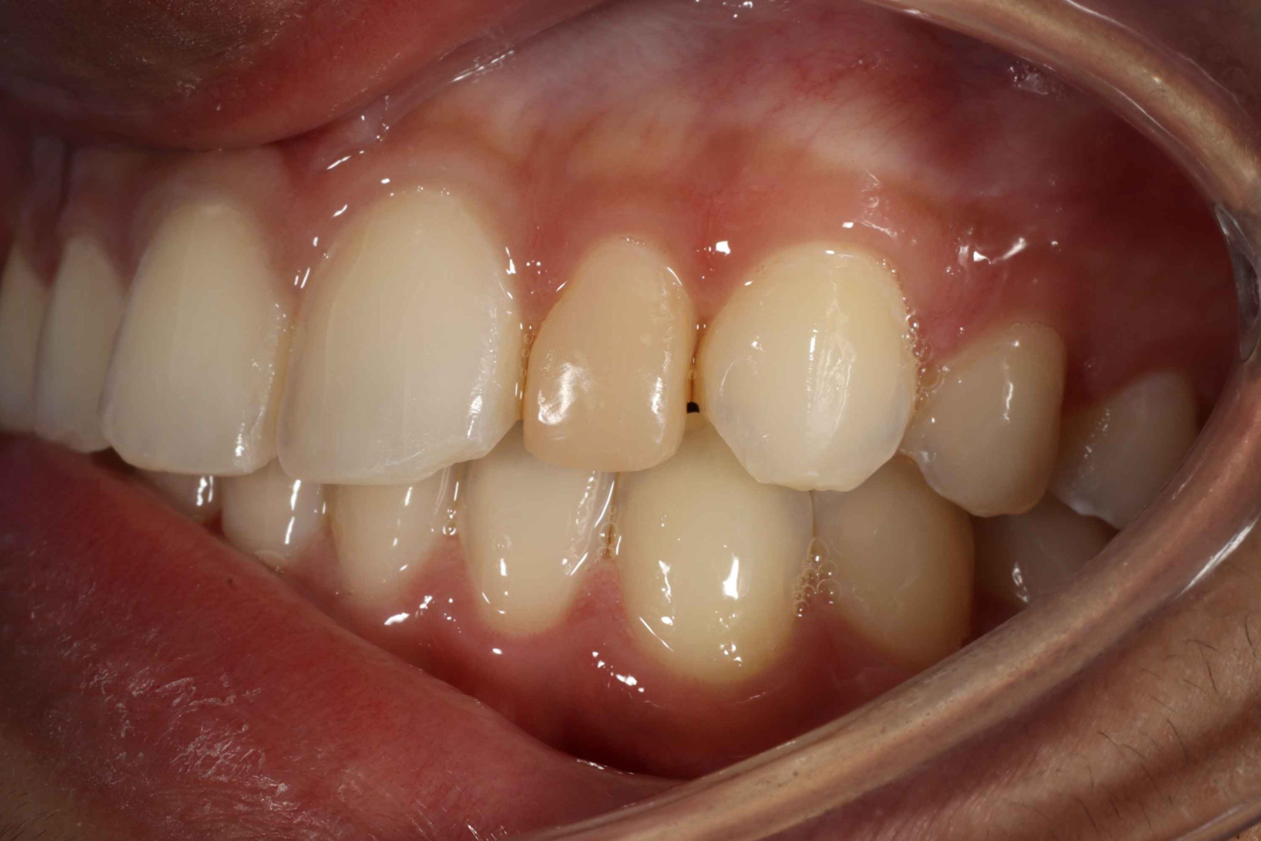 During orthodontic treatment, this patient received a composite veneer that eventually became discolored. Unfortunately, his older brother frequently pointed out the difference in color, which made the patient increasingly self-conscious about his smile.